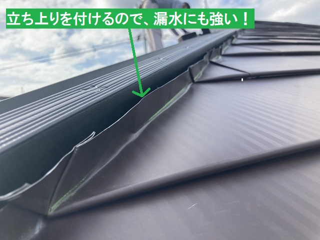 更に、平部のガルバリウム鋼板屋根材を立ち上げる事で、棟の脇からの浸水も面で防いでくれる対策を施す事で、漏水に強い棟下地が出来上がります!