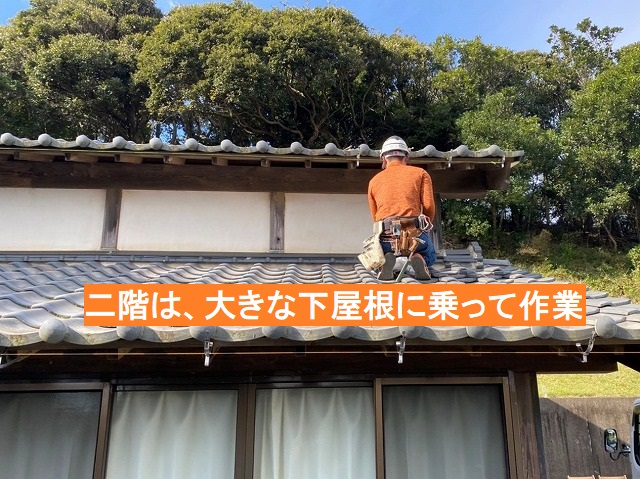 1階部分は脚立足場で行い、2階部分は下屋根に乗っての作業です。