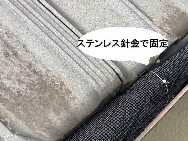 落ち葉除けネットの留め具は、塩害を考慮したステンレス針金を採用しました。