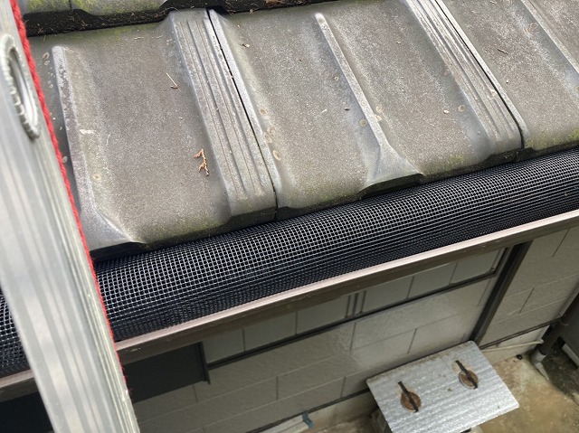 軒樋に落ち葉除けネットを設置