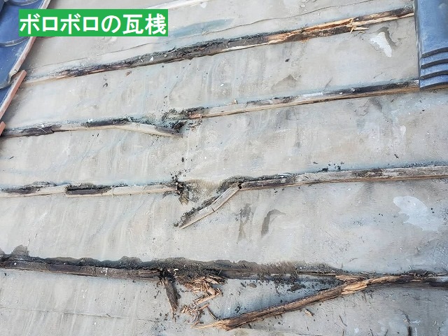 瓦を捲り下地を確認すると、瓦を引っかける瓦桟がボロボロになっていました。