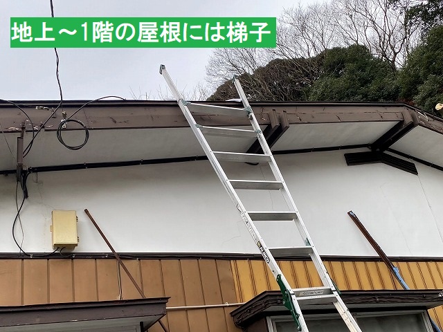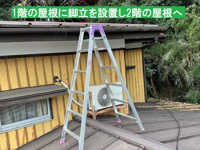 水戸市の現場は、梯子と脚立で屋根に登って作業を行います。