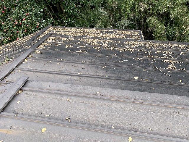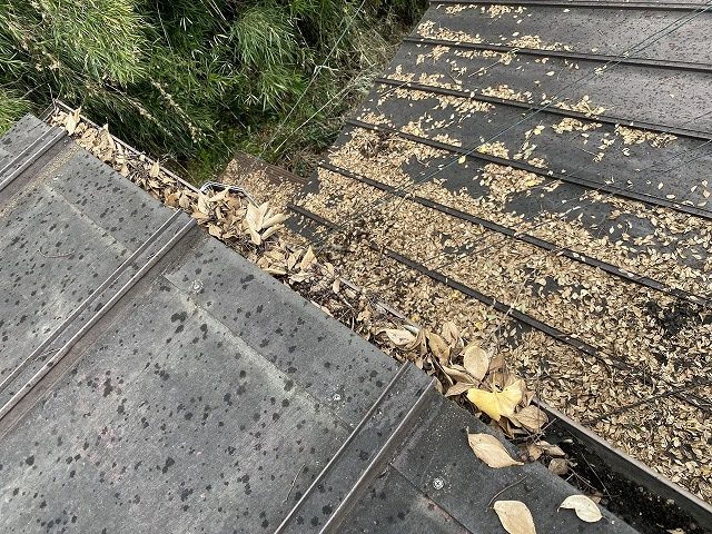 今回は、屋根に積もった枯葉や枝葉の掃き落とし清掃と雨樋の詰まり解消依頼です。
