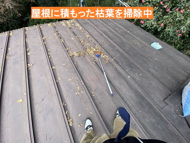 こちらの水戸市のお宅は、屋根の他にも家の周り全体に枯葉が無数に散らばっており、屋根から掃き落とした後にお客様が全体的に掃くとの事です。
