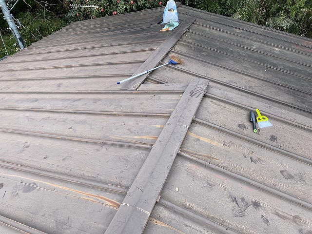 今回の水戸市の屋根は、傾斜が穏やかな暖勾配なので屋根上から作業しますが、同様の作業内容でも傾斜がキツイ屋根は足場の設置や高所作業車などが必要です。