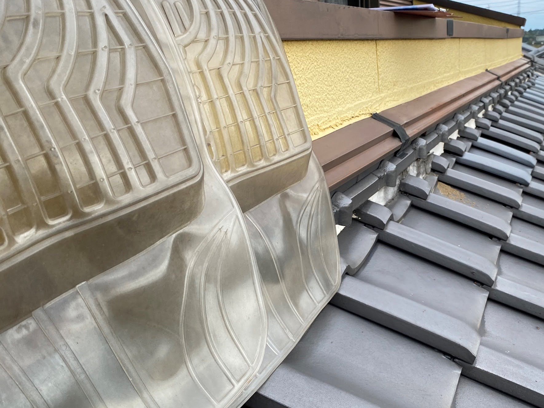 また、今までは熨斗瓦の土台に葺き土を使い漆喰で保護していましたが、今回は葺き土は使わず、なんばん漆喰で全体を固体化する事で崩れにも強い葺き止めに仕上げます!