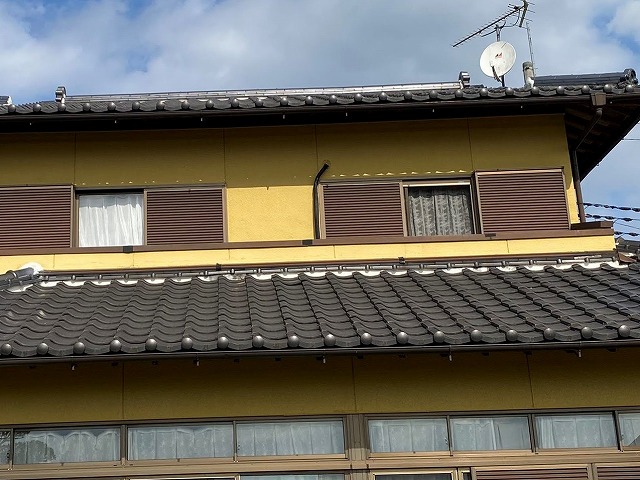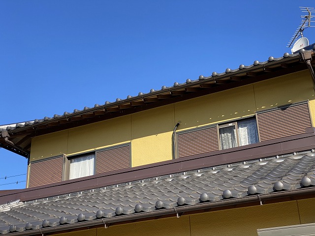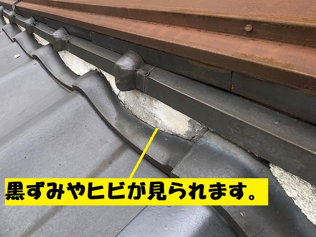 次に、外壁と瓦屋根の取り合いである葺き止め部ですが、葺き止め漆喰全体に黒ずみとヒビが確認できました。