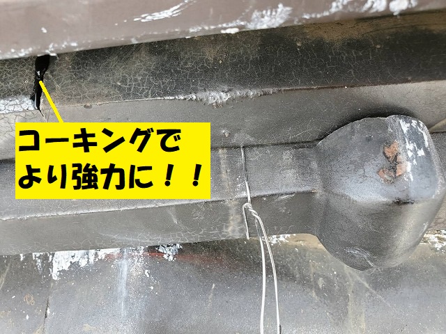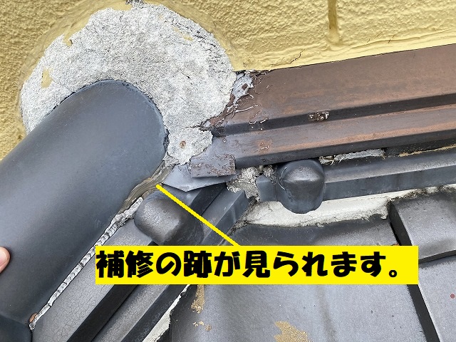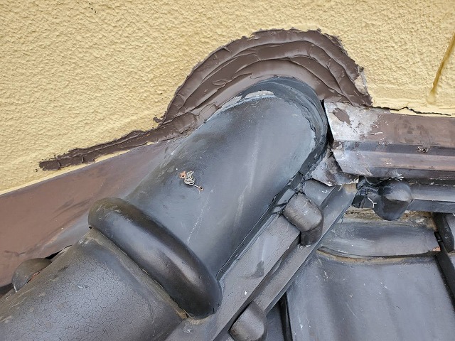 この箇所は、瓦屋根の降り棟(斜めに降る棟瓦)とベランダ外壁の取り合い部ですが、コーキングで補修した痕跡が残っていました