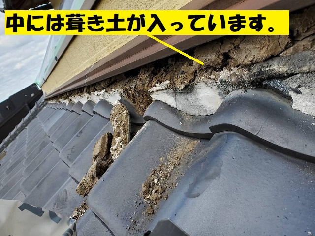 水戸市の現場は熨斗瓦が二段積みなので二段とも抜いていきますが、熨斗瓦を抜くと漆喰の裏側に土が入っているのが分かりますね。