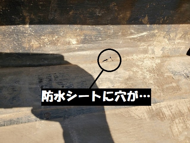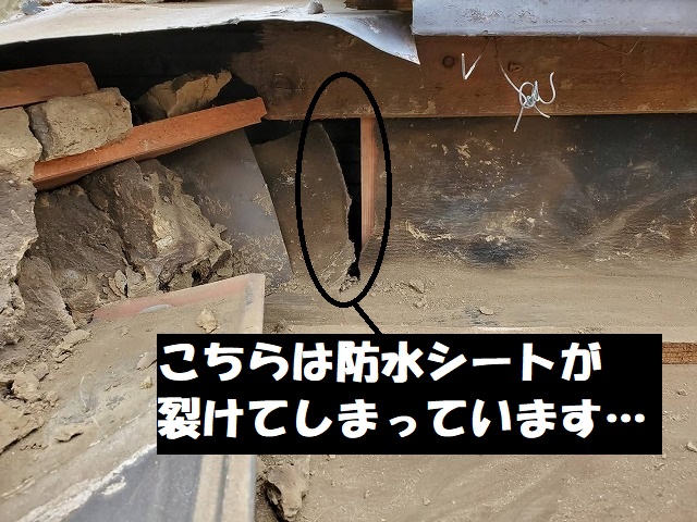 さらにこの葺き土を撤去すると防水シートが見えるのですが、穴が開いてしまっていたり、ひどい箇所だと裂けてしまっていたり…(; ・`д・´)