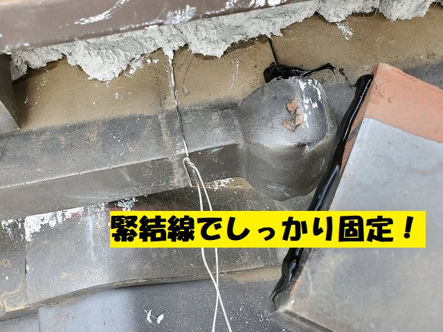 一段目の熨斗瓦はステンレス線でしっかり緊結し、その上下には先ほどのなんばん漆喰を施工しました。