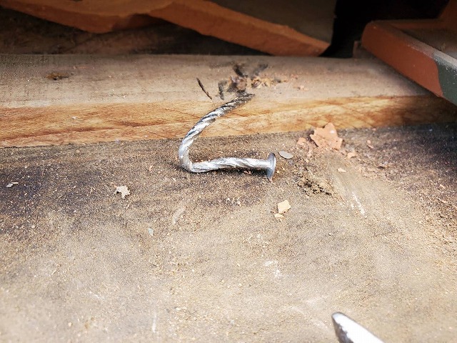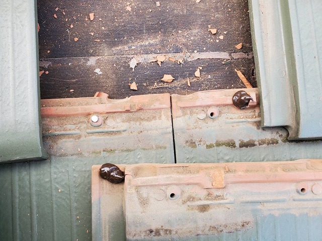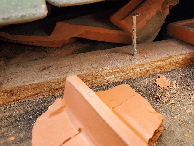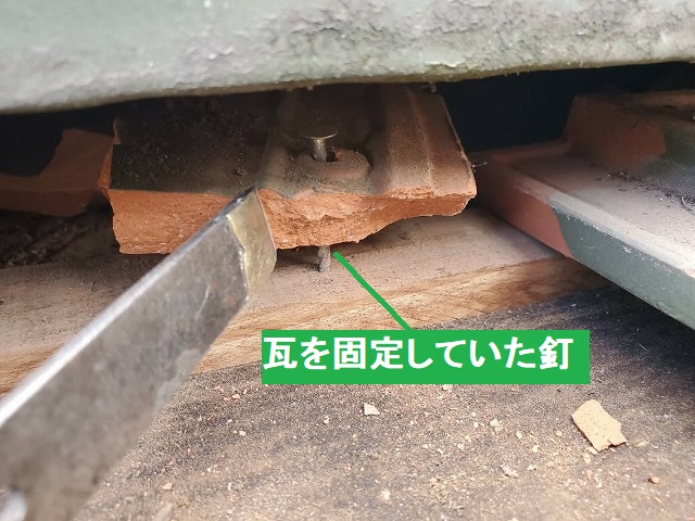 隙間から覗くと、瓦を止めていた釘が確認できますね。