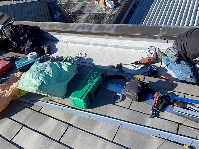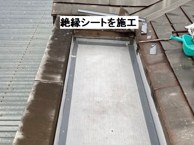既存の防水シートに絶縁シートを施工して下地を形成します。