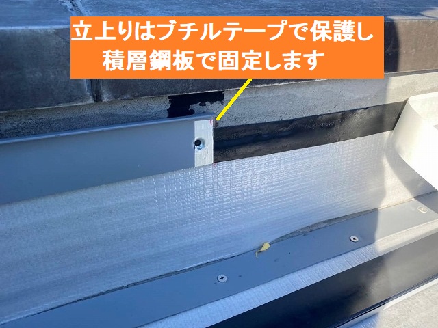 立上りの漏水リスクの高い箇所は、ブチルテープと積層鋼板でダブル固定します。
