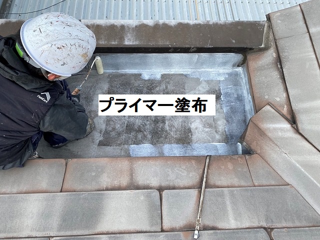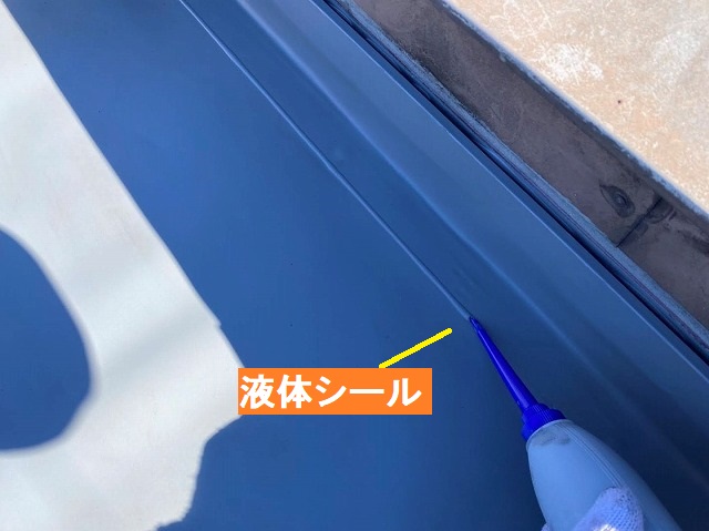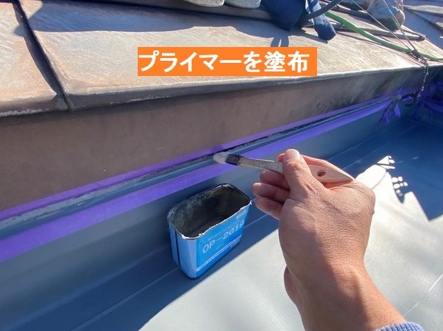 水上側の隙間には、コーキング材と基材の接着を強固にする為のプライマーを塗布し、コーキング材を充填して更に漏水対策を施します。