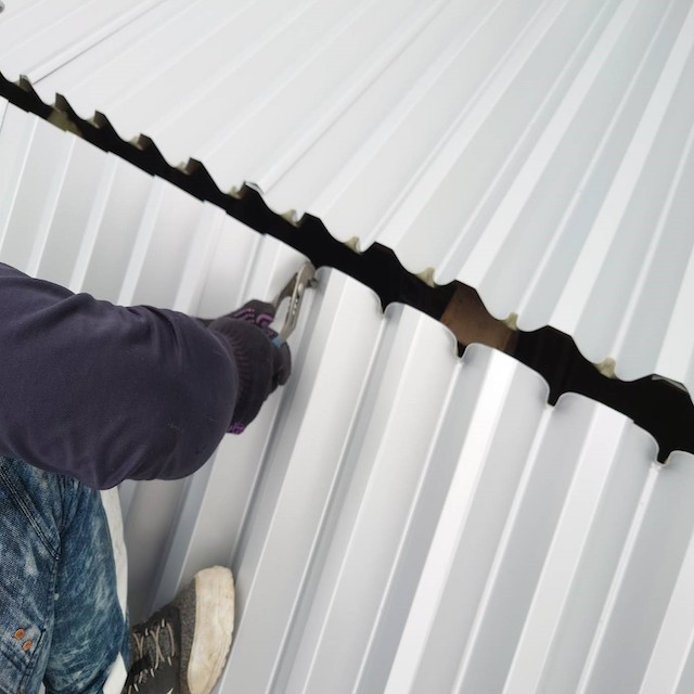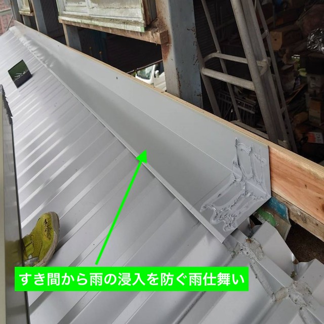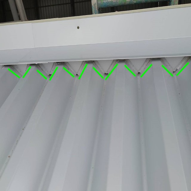 折板屋根の凹凸部から、雨水が浸入しないように、外壁との境目にもケミカル面戸を施工しています。