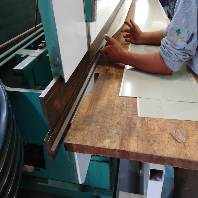 現場での加工が難しい部材は、現場でキッチリ計測を行い、寸法どおりに工場で板金加工しています。