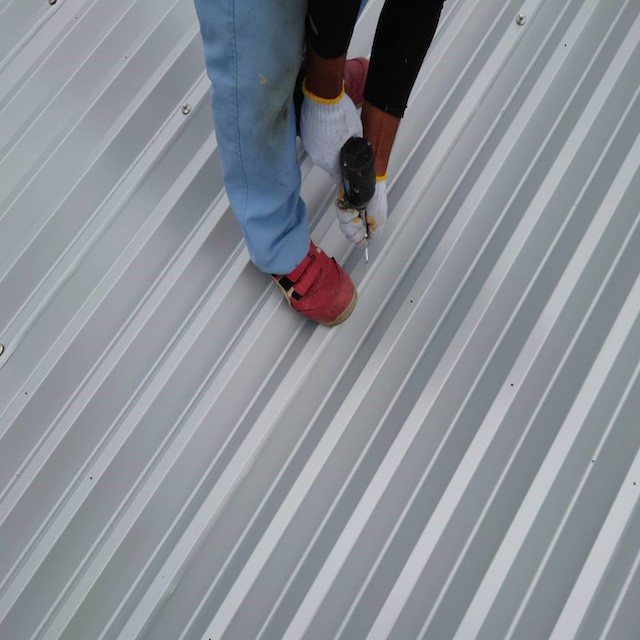 今回の現場は鉄骨下地なので、鉄骨まで届くビスを打ち付けガルバリウム鋼板製の折板屋根材をしっかりと固定させる方法で対応しました。
