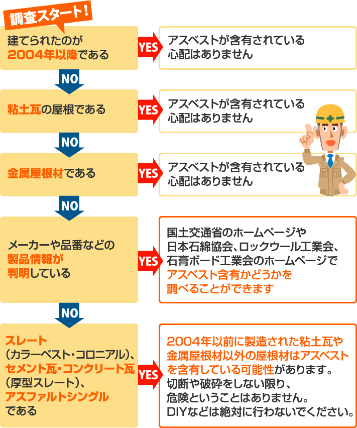 アスベストが含まれているかも・・・とご心配の方に、簡単なフローチャートをご用意しました。それでもよく分からない場合は、街の屋根やさん水戸店にご相談くださいね(^_^)