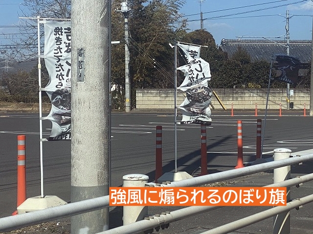 ご近所の店舗さんののぼり旗が煽られている様子からも、当日の風の強さがお分かりいただけるかと思います。