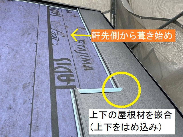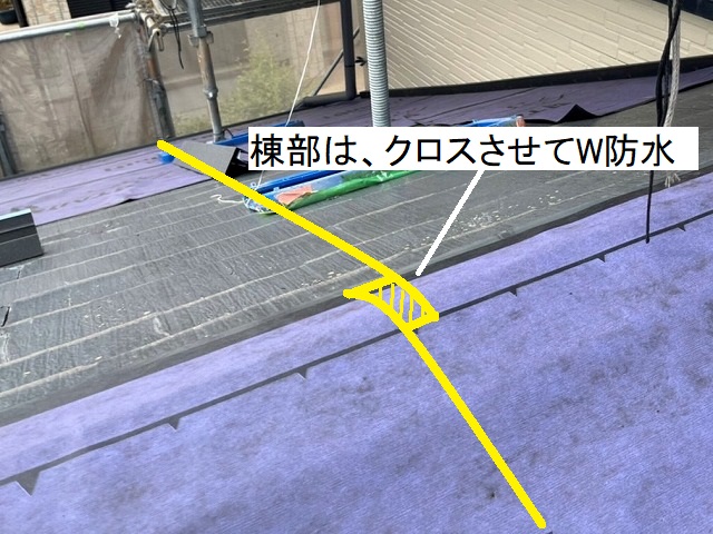 防水紙は、雨樋のついている軒先方向から施工し、屋根の頂点である棟部は、双方から敷設した防水紙をクロスさせ、防水紙が二重になるようにW防水施工で敷設します。