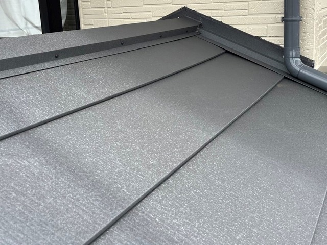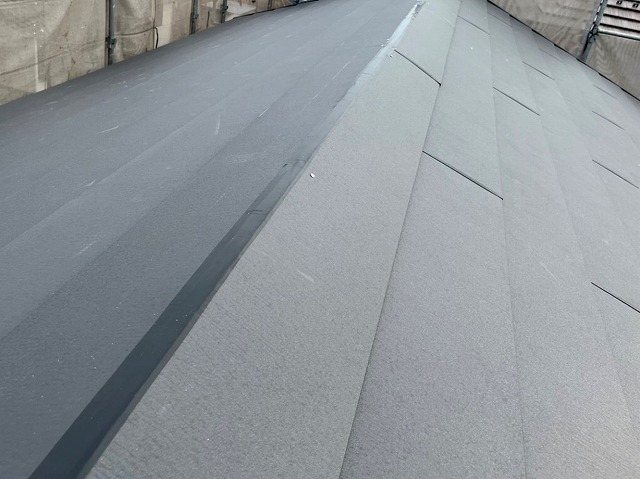 - 使用材料:スーパーガルテクト(色:シェイドチャコール)・遅延粘着式防水紙タディスセルフ・樹脂製垂木・工場加工棟板金