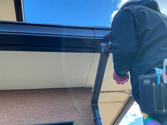 雨樋清掃を完了させ、仕上げは、微量な漏れがある雨樋継ぎ手部分への接着修理です。