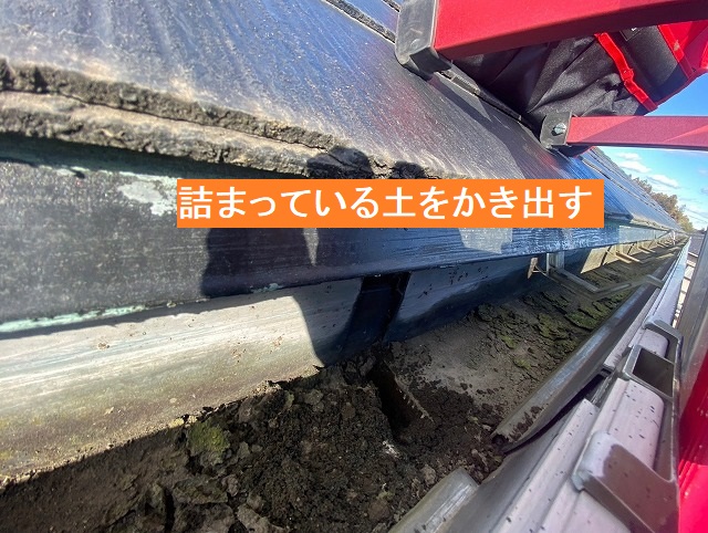 強風で畑の土が舞い上がって少しずつ積ったものが詰まらせてしまった原因のようです。