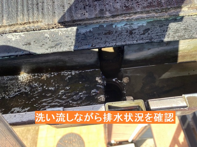 雨樋清掃方法は、詰まっている物をかき出し、洗い流しながら排水を確認する作業です。
