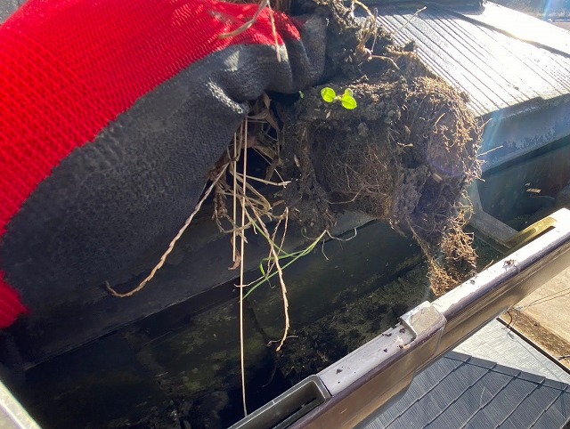 雑草を根っこごと引きぬき、洗い流して排水状況を確認!