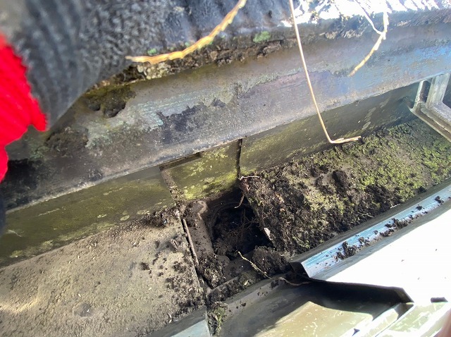 オーバーフローしている雨樋や漏れていると思われる部分は複数箇所ありましたが、先ずはお客様では確認の難しい2階の雨樋集水器部分から確認しました。