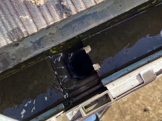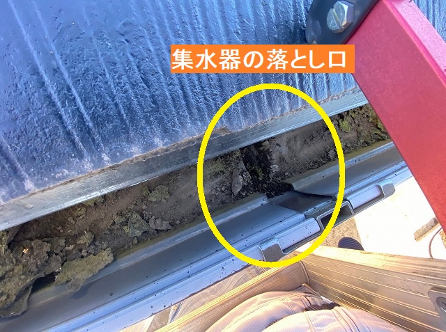 ヨコ方向からタテ方向に排水する為の、集水器の落とし口が土で塞がっています。