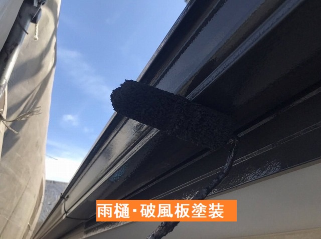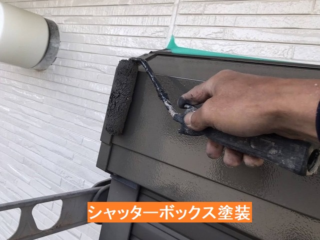 外壁が仕上がったら、付帯部である雨樋や破風板、シャッターボックスの塗装です。
