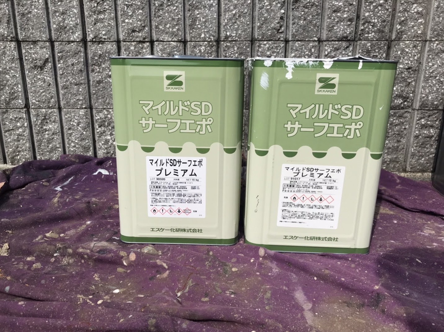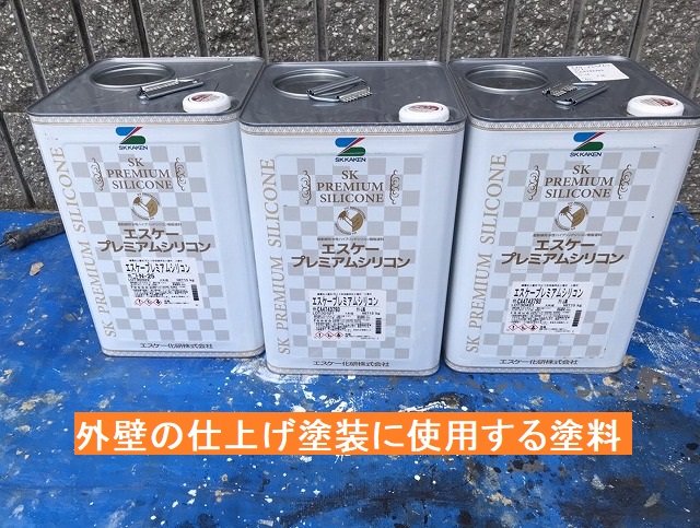 今回使用したのは、エスケー化研さんのプレミアムシリコンで、外壁を二色分けで塗る為、二色の塗料をご用意しました。