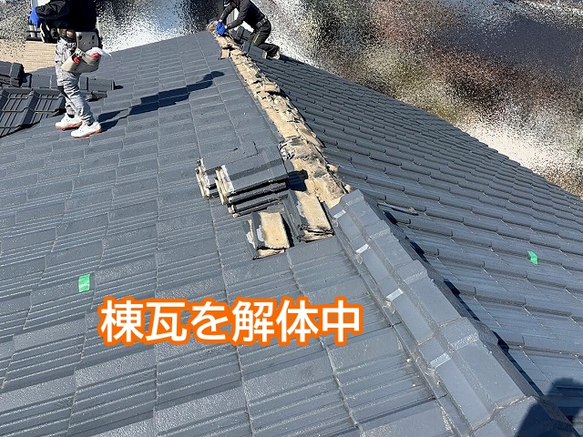 まずは屋根の一番高い位置にある棟の解体作業からスタート!