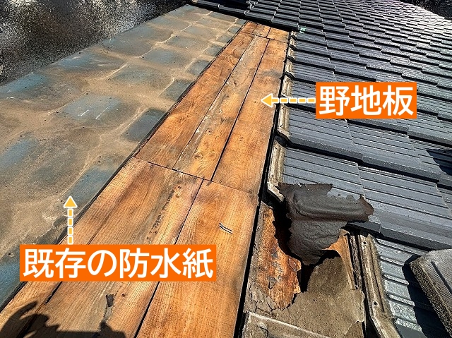 棟瓦に続いて平瓦も撤去したところで、防水紙の劣化状況を確かめます。