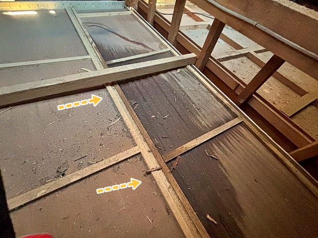 この状態で再度天井裏に入り、雨漏り箇所を確認。