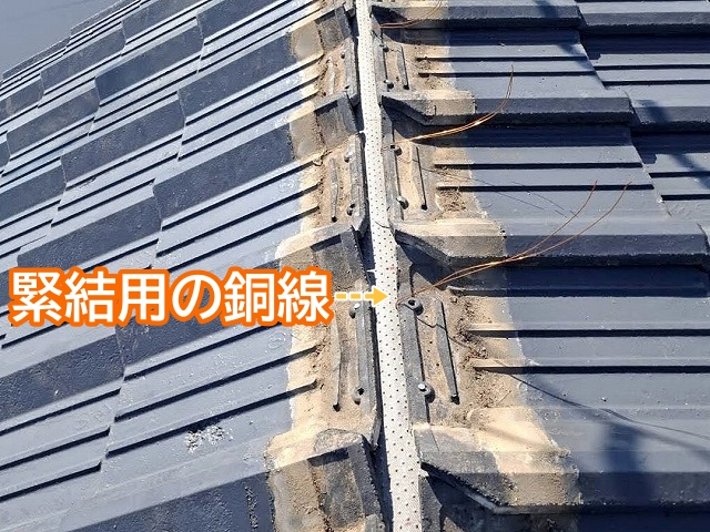 雨風をしのぐだけではなく、棟を仕上げる最終的な装飾瓦として使われる冠瓦は、緊結用の銅線でしっかり固定しました。