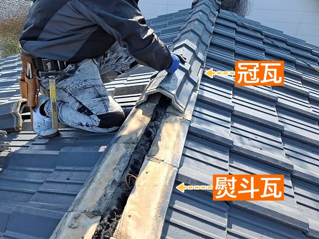 長方形の平たい熨斗瓦(のしがわら)の上に、蓋をするように冠瓦(かんむりがわら)を載せていきます。