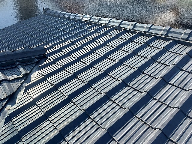 築年数的には新しい屋根材に替える方が望ましいのですが、数年前に塗装を行ったセメント瓦の状態が比較的よかった点と、あまり長くお住いにならないとのことで部分的な葺き直しで改善しました。
