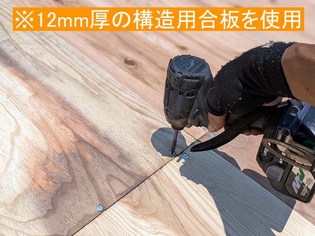 厚み12㎜の針葉樹構造用合板を使用して、上から増し張りしていきます。