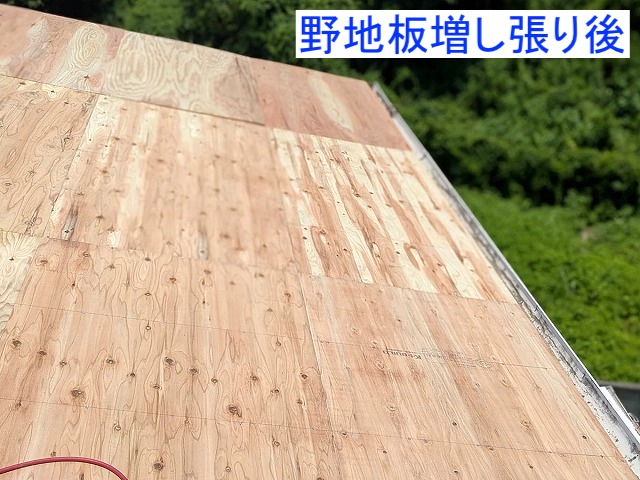 昔ながらの屋根下地材であるバラ板に、新しい野地板を重ねて張る「増し張り」という補強工事を行いました。