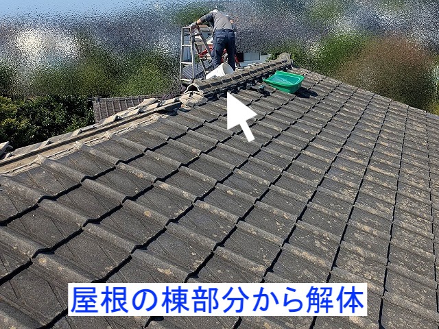 足場仮設後、てっぺんの棟部分から順に解体していきます。