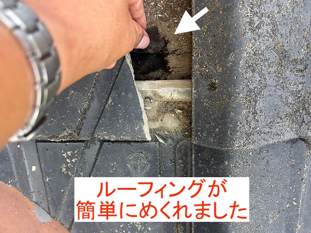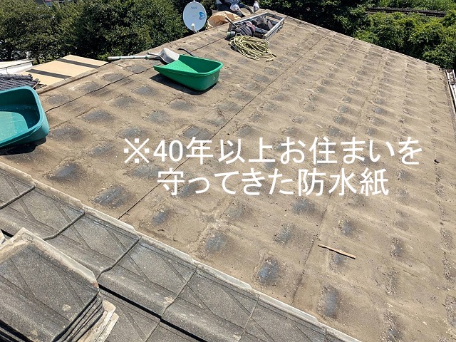 築40年以上経過した屋根材は経年劣化で割れており、その下のルーフィング(防水紙)も破損して手でたやすくめくれる状態Σ(゚д゚;)