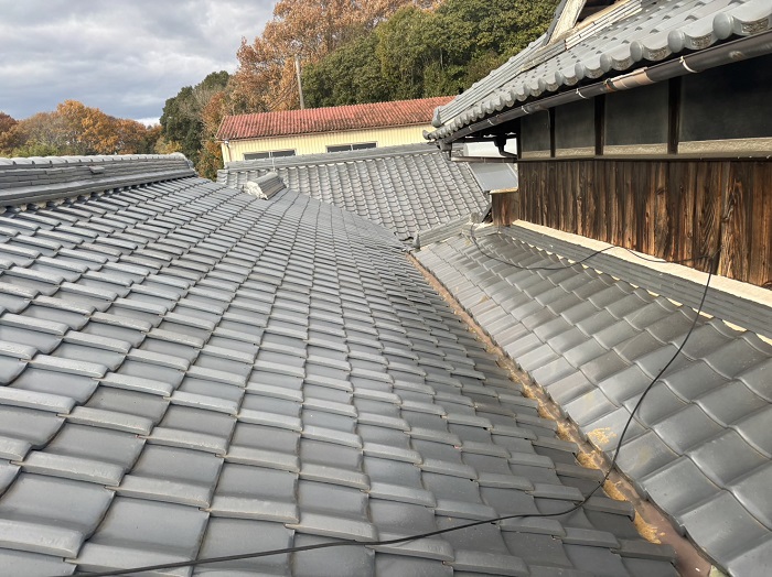 この様なご相談を加東市にお住まいの方より頂きました。調査したところ、屋根と屋根の取り合う部分の谷から雨漏りしているようでしたので、そこに関与している2面の瓦屋根を葺き替えるご提案となりました。