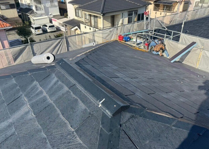 続いて!スレート屋根改修工事の仕上げ工程、棟板金の取り付けをご紹介します😊🔧✨
