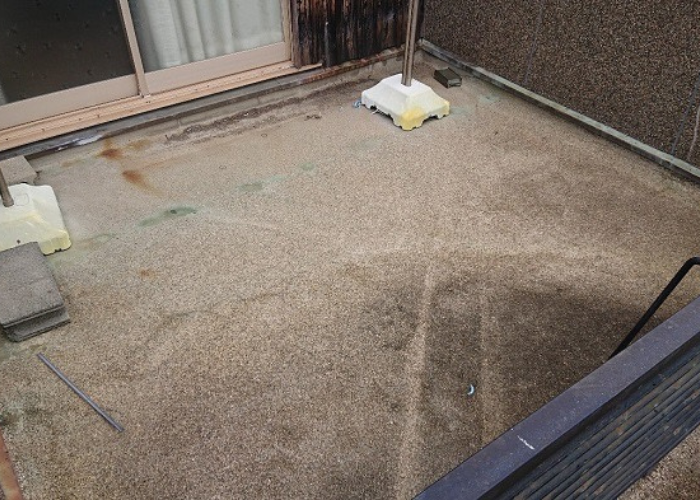 コンクリート製のベランダにはこれまで防水処理が施されておらず、劣化が進んだ状態。