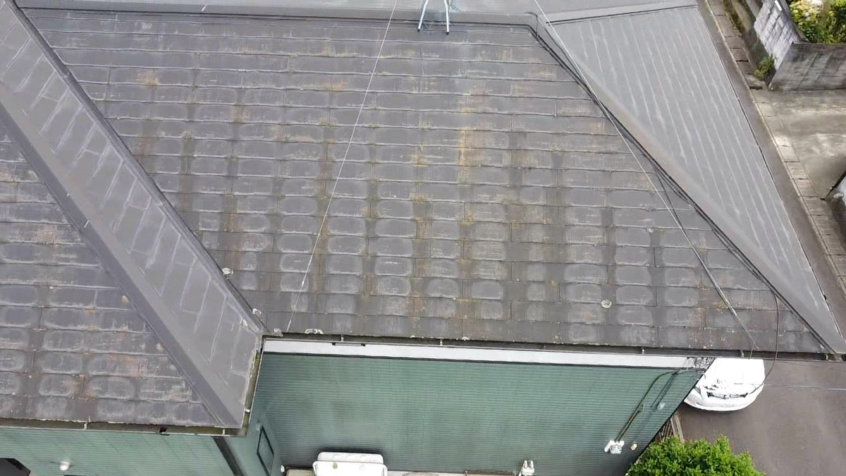 これもドローンで撮影したもので、苔の繁殖や屋根材に残った水の流れ跡が、劣化の状況を示しています📸✨