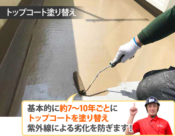 特にFRP防水のトップコートは、表面の保護膜のような役割を担っており、定期的な塗り替えメンテナンスが重要です。