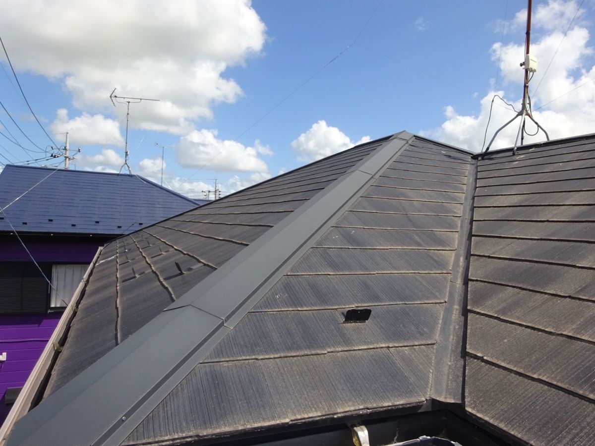 今回の工事では、不自然にめくれた棟板金の補修と屋根全体の遮熱塗装を行い、